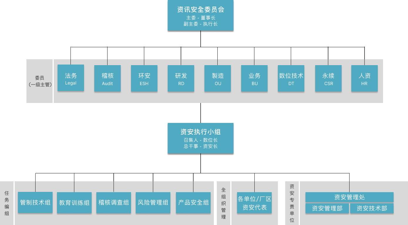 资讯安全委员会为好体育官方app下载资安最高管理组织,向董事长报告。下辖资安执行小组负责推行资讯安全委员会之各项决议。为持续建构完整且精实的资安专 责团队,资讯安全管理处下成立「资讯安全管理部」与「资讯安全技术部」,持续投入资源以强化团队资安核心能力。